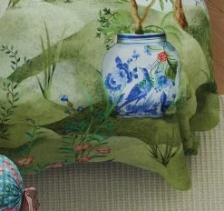 In the foreground are decorative blue vases filled with stylised plants